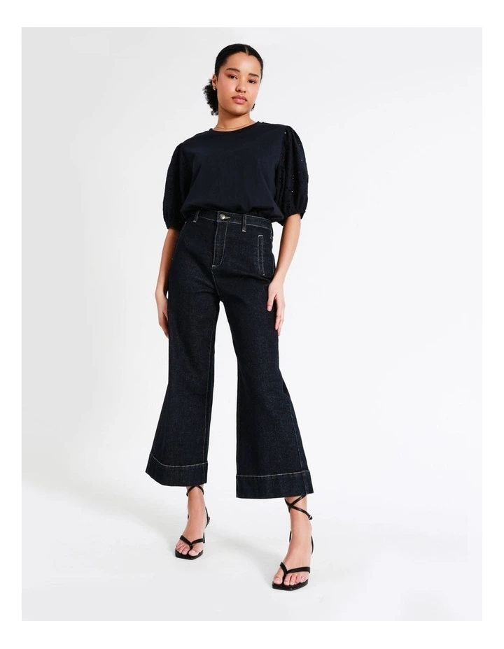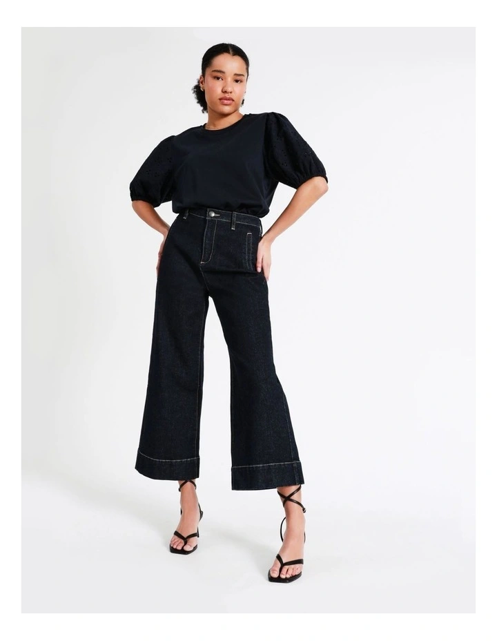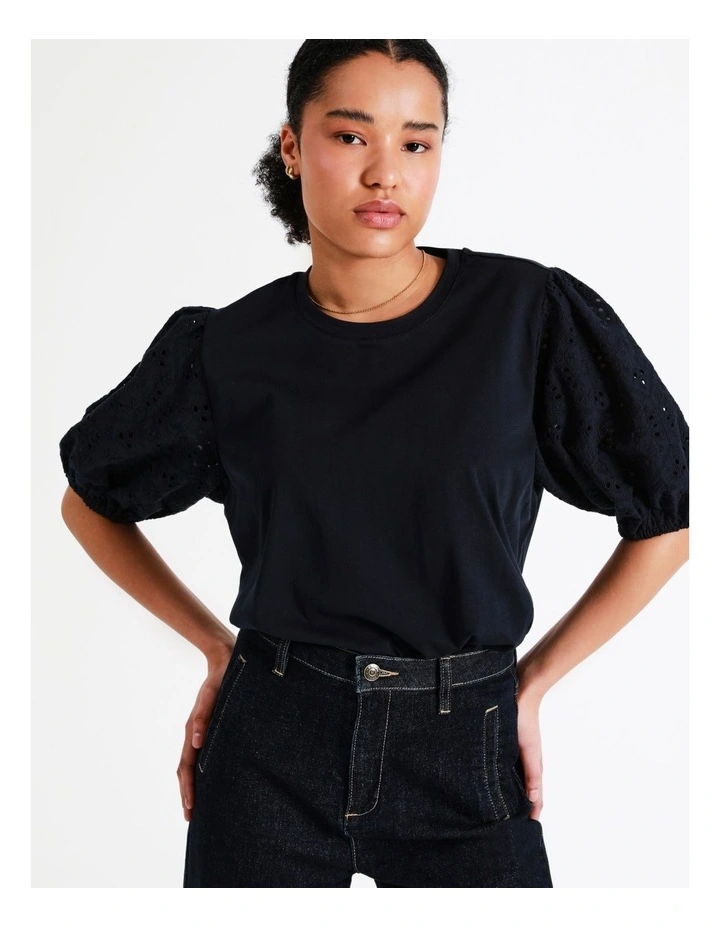 Basque Petites Cotton Broderie Sleeve Tee In Navy