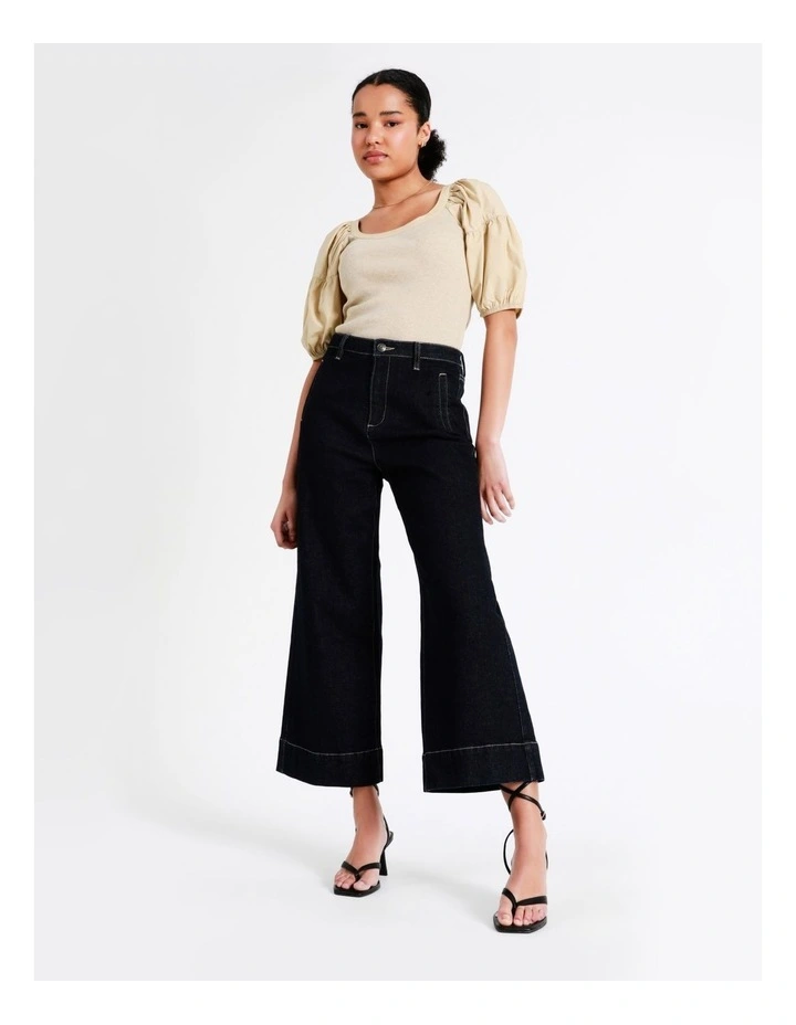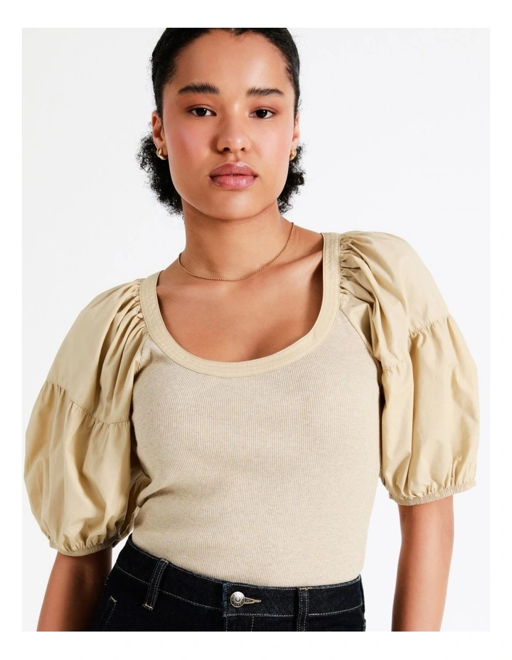 Style a fashion-forward look with a statement top. This top has a ribbed body, with contrasting poplin puff sleeves for some added drama. Wear it from day to night.