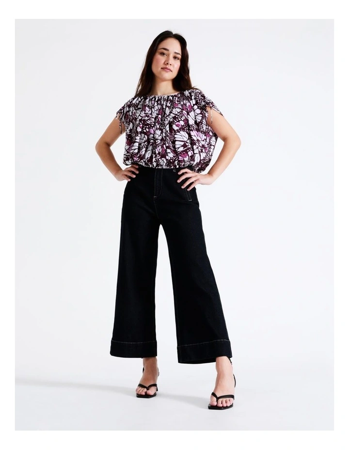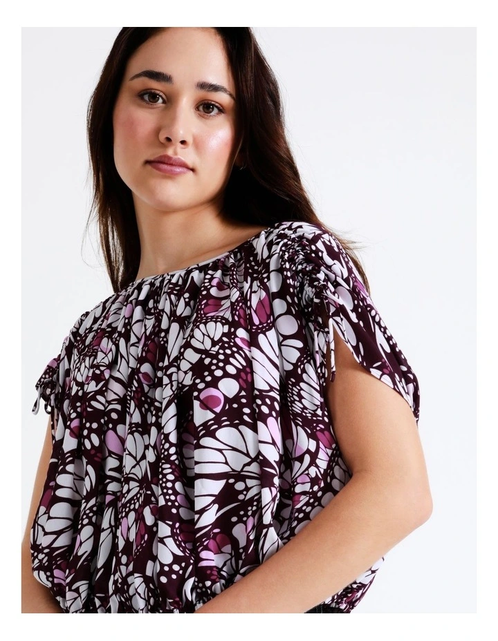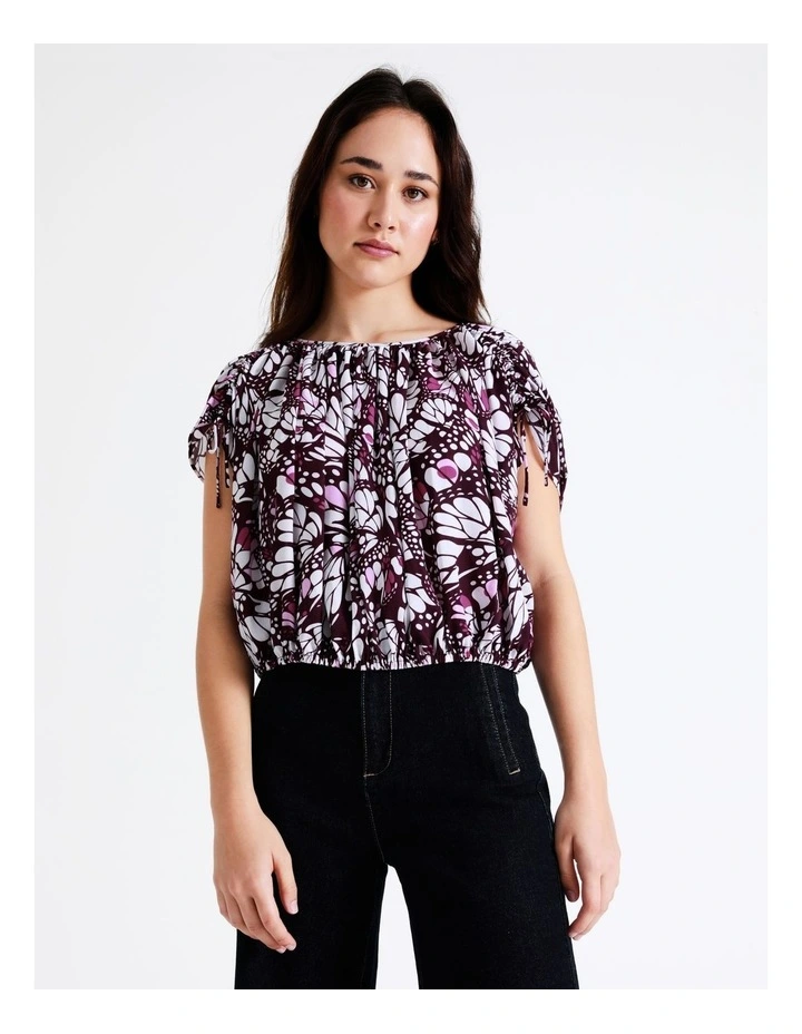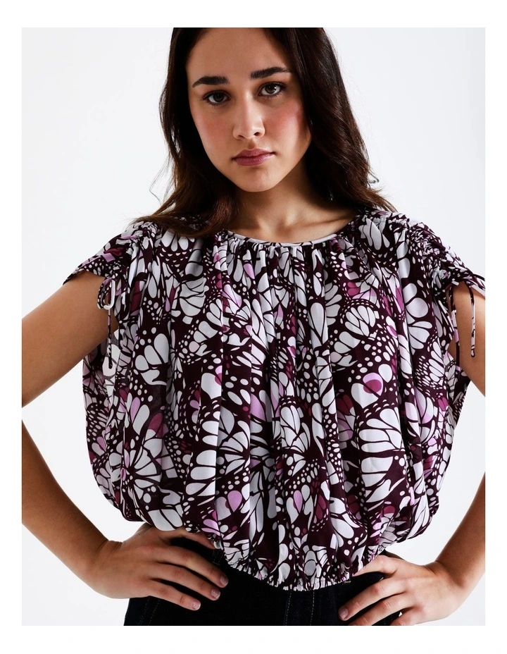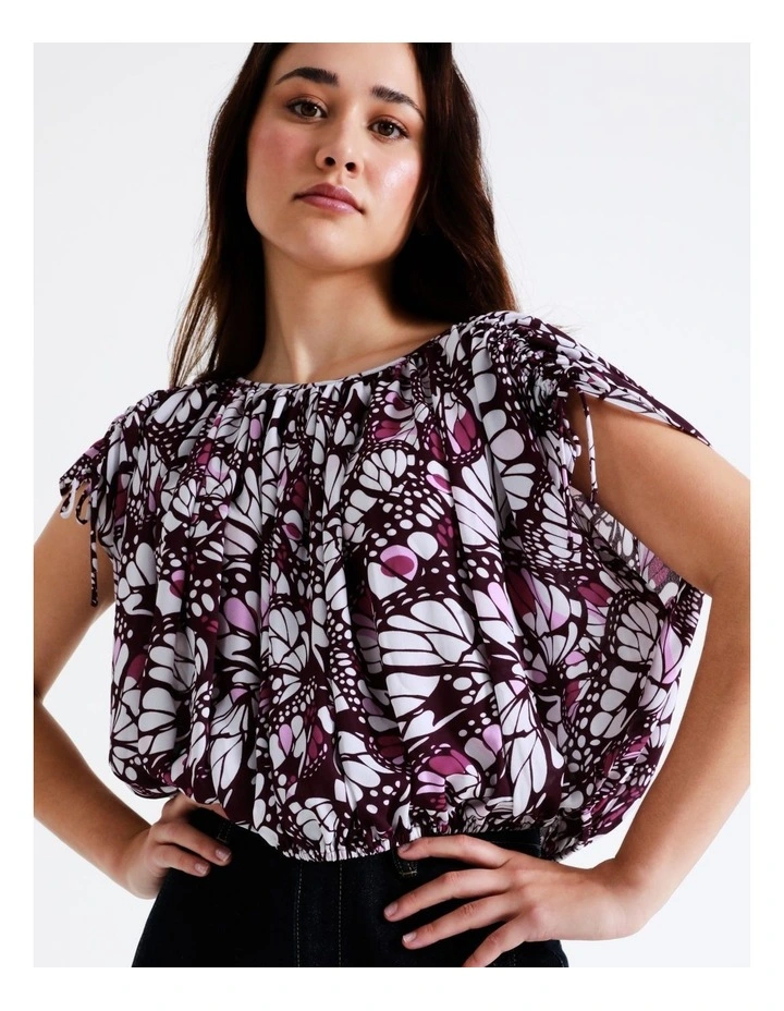 Elevate your everyday wear with a fashion-forward top. This top is decorated with drawstrings on the sleeves, alongside a vibrant all-over butterfly print. Wear it with your favourite mid rise pants for an on-trend look.