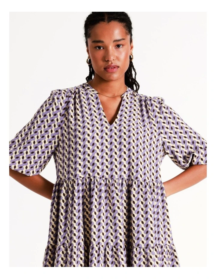 Style a statement look with vibrant prints. This dress boasts an eye-catching geometric print, alongside a flowing tiered silhouette for comfortable and stylish wear. A must have for versatile evening dressing.