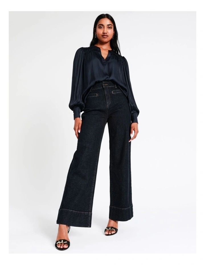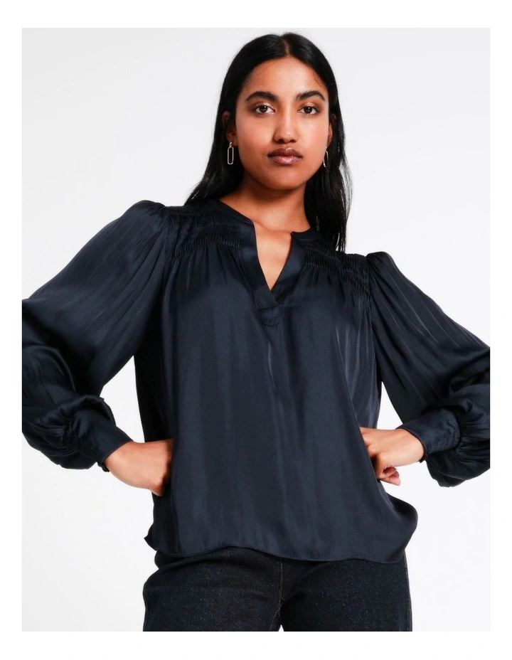 Basque Recycled Bruised Poly Satin Pintuck Top in Navy