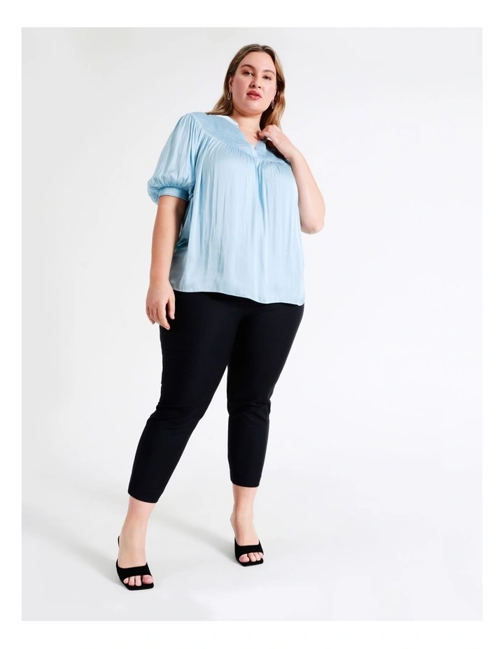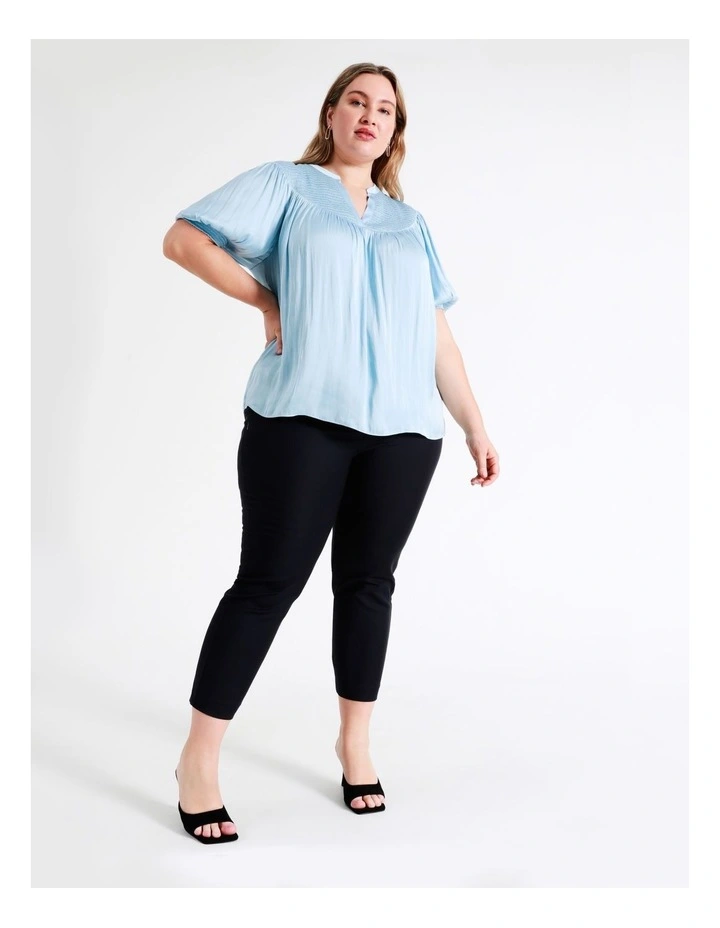 Basque Curve Shirred Yoke Recycled Bruised Poly Satin Top In Sky Blue