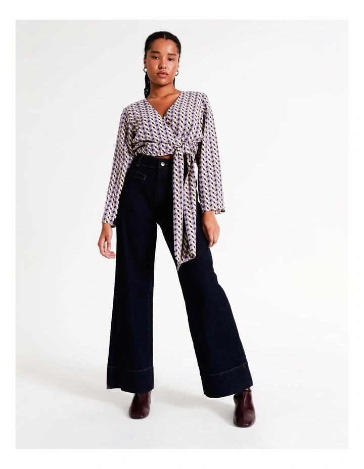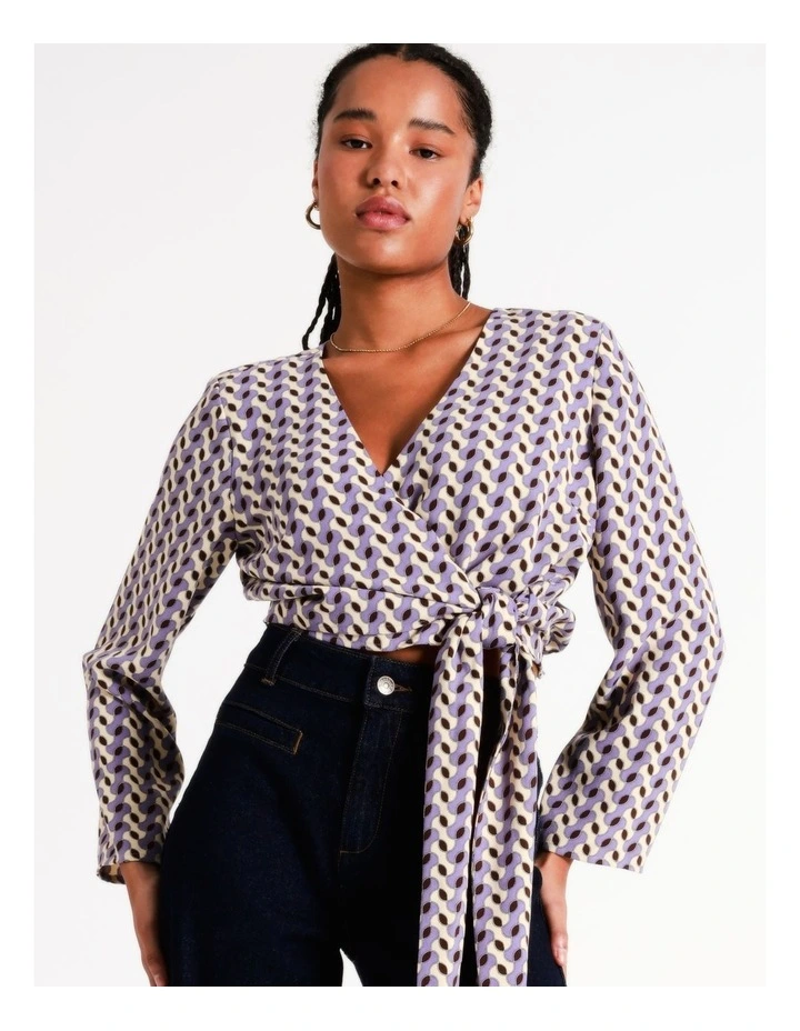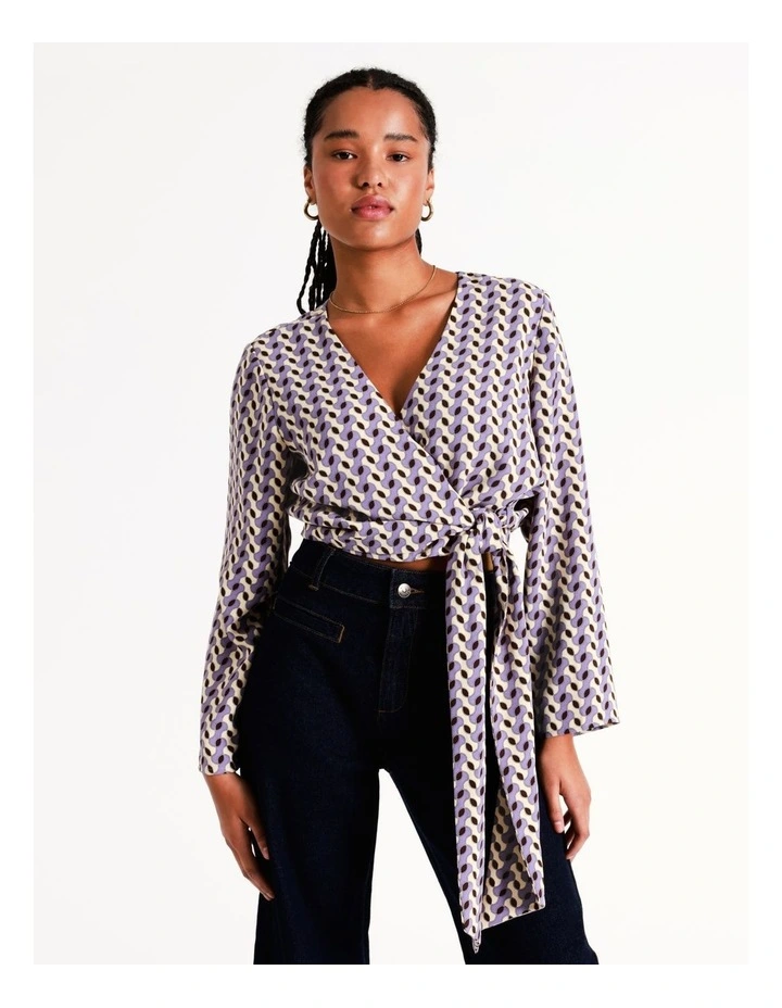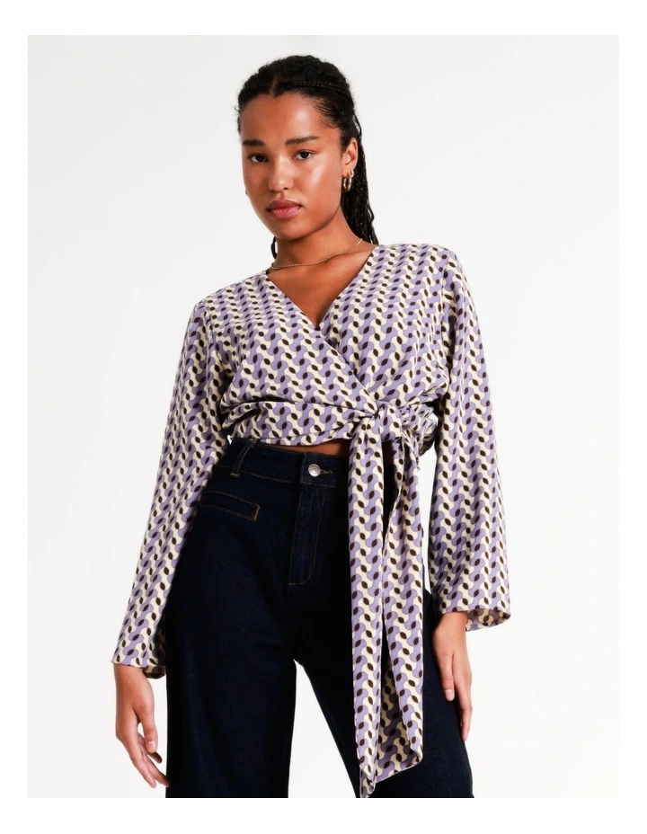 Style a statement look with vibrant prints. This blouse boasts an eye-catching geometric print, alongside a wrap design with a sash fastening for comfortable and stylish wear. A must-have for versatile evening dressing.